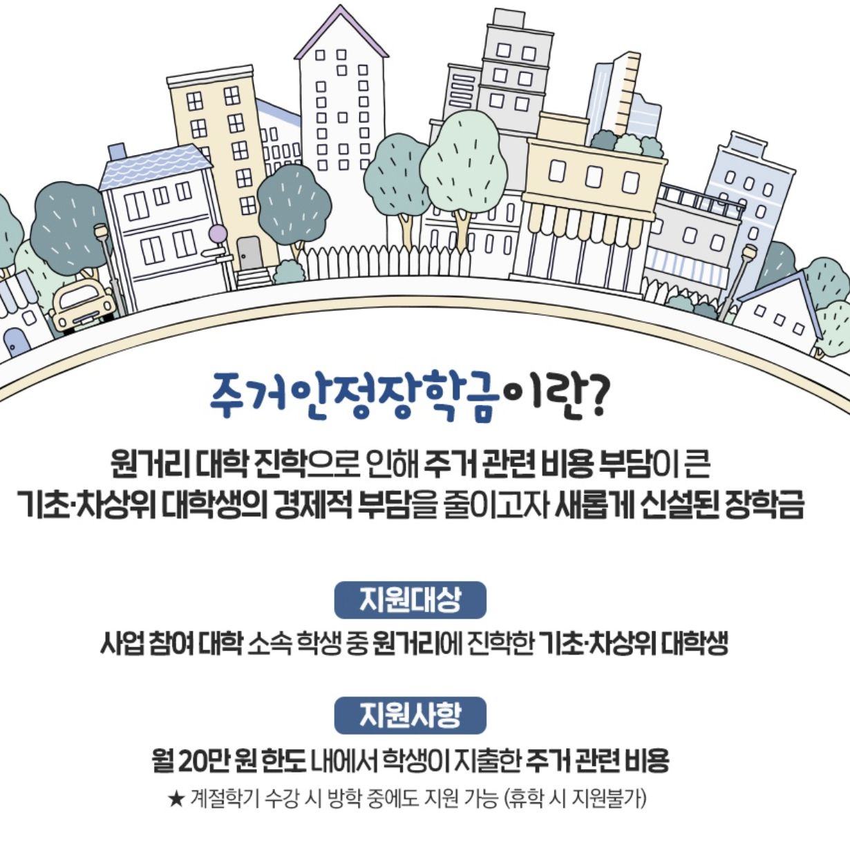 | 지원 기간 | 학기 중 지원 (계절학기 포함)주거안정지원금 20만원 신청하기 |